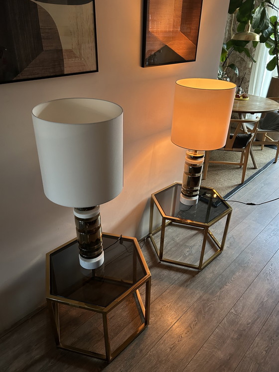Elevate your interior with this exquisite set of two table lamps from Richmond Interiors, embodying a luxurious hotel-chic aesthetic. The harmonious blend of polished metal and marble creates a timeless design that complements any sophisticated setting, whether placed beside a sofa, on a sideboard, or next to a bed.