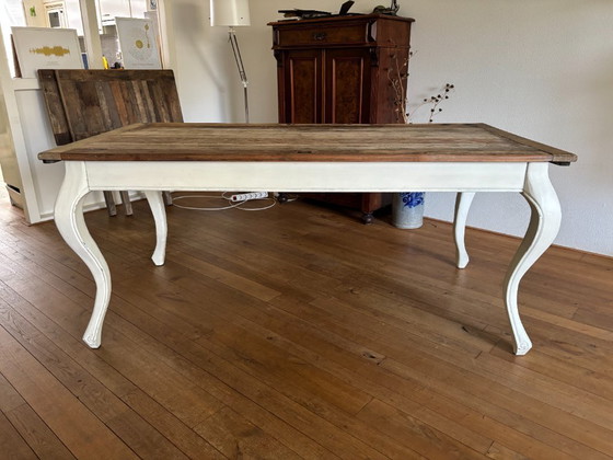 Riviera Maison Driftwood Dining Table. The table is 180 cm wide, with extension leaves of 50 cm each. With both leaves attached, the table is therefore 280 cm.