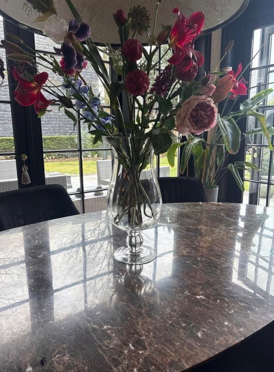 Beautiful, large glasses. The vase has an elegant base. Perfect for a dining table, sideboard, or as a decorative piece in any room.