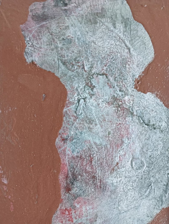 This captivating abstract painting by Rob Jacobs, titled "Fluitend door het leven," invites viewers into a world of texture and color. The artwork is a harmonious blend of earthy browns and greys, accented by subtle hints of red, creating a dynamic visual experience.
