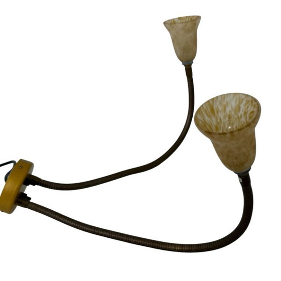 Duo headed gooseneck lamp designed by Rob Nollet for Deja Vu Nijmegen. Two glass shades house the bayonet type sockets and give out a warm glow. The lamp has two individual power switches mounted at the base. Can easily be mounted on any wall with two screws. Comes with a power cable (plug available upon request). will look best mounted over a junction box