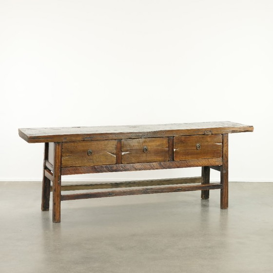 This beautiful antique Spanish sideboard dates from the 18th century and is equipped with three drawers for storing your belongings. It features a stunning solid top made from a single piece of wood. The item possesses an authentic character and a beautiful patina. It fits easily into almost any interior and adds just that little bit more warmth and a touch of elegance to your chosen space. Due to its age, it shows normal signs of use. Structurally, it is in good condition and ready for immediate use. Do you already know where you are going to place it?