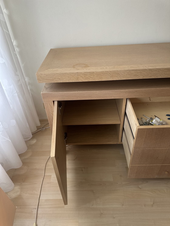 This exquisite Roche Bobois dressoir embodies the elegance and sophistication synonymous with the brand. Crafted from high-quality solid oak, this piece offers a warm hue that complements a variety of interior styles. Its modern design is both functional and aesthetically pleasing, making it a perfect addition to any living or dining space.