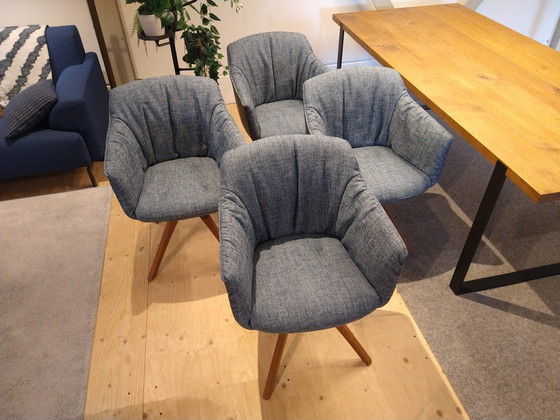Rolf Benz 641 Dining Chair (Set of 4) The 641 is a dining chair with a generously, casually upholstered interior and a sleek leather exterior. This contrast gives the chair a modern look while simultaneously exuding a homely coziness. Moreover, these bucket chairs offer exceptional seating comfort. A long evening of dining is certainly a risk you'll be taking with these chairs. The exterior is upholstered in dark blue leather, while the interior fabric is a lighter, matching shade of blue. The swivel base is made of clear lacquered walnut. Product details: * Brand: Rolf Benz * Model: 641, set of 4 * Exterior upholstery: Leather, 38.109 dark blue * Interior upholstery: Fabric, 17.049 dark blue * Base: American walnut, clear lacquered. * Mechanism: swivel * Dimensions: W58 x D60 x H83 cm * Seat height: 49 cm * Style note: Modern swivel chair, without return mechanism.