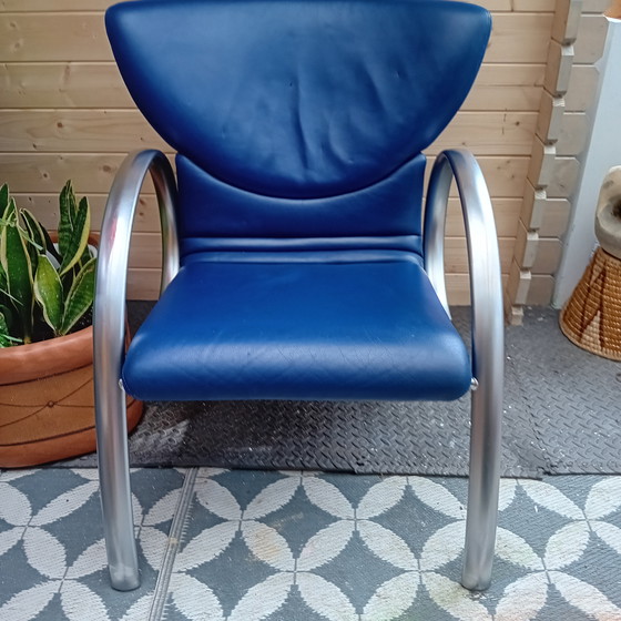 This Rolf Benz chair from the 80s/90s is a wonderful example of retro design. The chair has a striking blue leather upholstery and a sturdy metal frame, ensuring both comfort and durability. Its unique design with curved armrests makes it a real eye-catcher in any room. Perfect for lovers of vintage and retro styles.