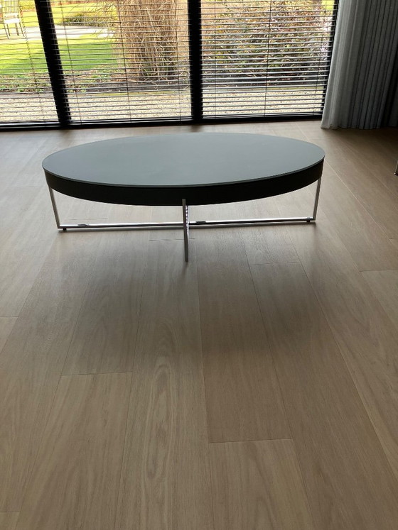Body is MDF lacquered RAL 7022. Base is steel, polished chrome-plated.