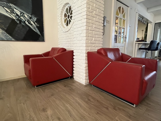 Two beautiful red armchairs by Ron Benz, model 350. Made of genuine leather and finished in a heavy, high-quality finish. The armchairs are in perfect condition and offer excellent seating comfort. Timeless design and a luxurious appearance—a true asset to any interior.