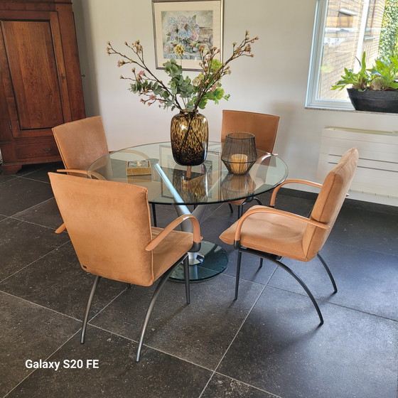 Discover the refined elegance of the Rolf Benz dining set, a perfect combination of modern design and high-quality materials. This set consists of a stylish table with a clear glass top and a robust base of aluminium and chrome, giving it a contemporary look. The matching chairs are upholstered in luxurious Alcantara fabric and feature solid maple armrests, ensuring both comfort and style. The metallic graphite legs are fitted with felt glides to protect your floor. Ideal for design enthusiasts looking for a combination of functionality and aesthetics. Contact us today for more information or to schedule a viewing.