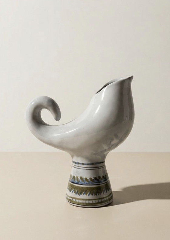 Roger Capron, Capron Vallauris, Vallauris 1950s, Vallauris ceramics, Capron workshop, post-war French ceramics, modernist ceramics, 1950s design, mid-century modern, mid-century French design, zoomorphic ceramics, zoomorphic pitcher, rooster pitcher, ceramic rooster, French decorative art, 20th-century decorative arts, artistic ceramics, glazed ceramics, bluish-white glaze, stylized foliage decoration, Vallauris production 1950, Vallauris school, French ceramic revival, 20th-century French ceramist, piece signed by Capron, Capron collection, design collectible, vintage design gallery, 1950s design antiques, 1950s organic design, utilitarian sculpture, vintage tableware, French craftsmanship, Mediterranean tradition, modernist influence, French modernism, 1950s aesthetic, French vintage art, piece