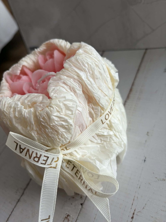 Introducing an exquisite rose candle, a perfect embodiment of elegance and charm. This candle, crafted with meticulous attention to detail, features delicate pink rose petals that are beautifully encased in a soft creme wrap, creating a stunning visual appeal.