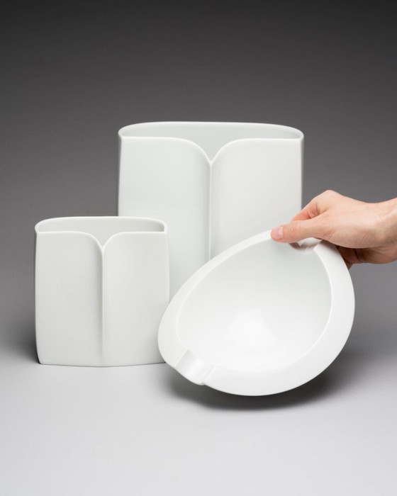 Placed together, these three objects form a compact survey of late-20th-century European porcelain thinking. The glossy white glaze—typical of Rosenthal’s pursuit of technical perfection—eliminates distraction, allowing form alone to carry meaning. What emerges is a dialogue between volume and void, symmetry and deviation, seriality and singular gesture.