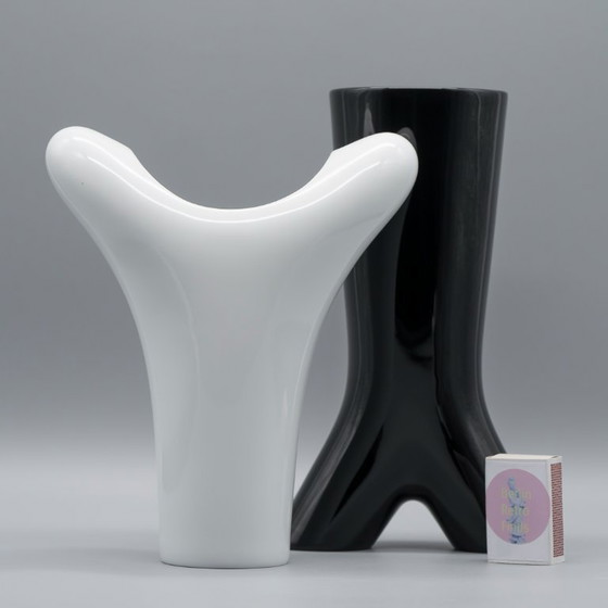 Manufactured in Germany by Rosenthal—long celebrated for pioneering collaborations with world-class designers—these Studio-Line pieces showcase the technical finesse and aesthetic boldness that marked the brand’s approach during the 1990s. The smaller white vase measures 22 cm in height, 18.5 cm in length, and 8.5 cm in width; the black one stands slightly taller at 24 cm. Both pieces are marked with the Rosenthal logo and bear the etched facsimile signatures of the designers, attesting to their authenticity and collectible status.