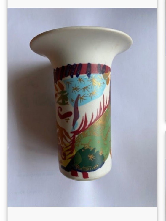 Colorful and expressive vase from the renowned German porcelain brand Rosenthal, designed by the French artist Portanier. This approximately 12 cm tall piece displays a vibrant composition of stylized figures, abstract patterns, and bold color fields in red, yellow, blue, and black—a recognizable style reminiscent of modern art movements like cubism and expressionism. Portannier's work for Rosenthal is known for his artistic flair and decorative power, and this vase is a beautiful example. Marked "Rosenthal Germany" on the bottom, confirming its authenticity and quality. Details Height: approx. 12 cm Designer: Portannier Mark: Rosenthal Germany Material: Ceramic/Porcelain Condition: Excellent, no chips or cracks Decoration: Colorful, artistic, modernist Why this vase is special Designed by Portannier for Rosenthal Compact size, ideal for an accent piece or display case Artistic appearance with museum-quality appeal Perfect for lovers of modernist ceramics