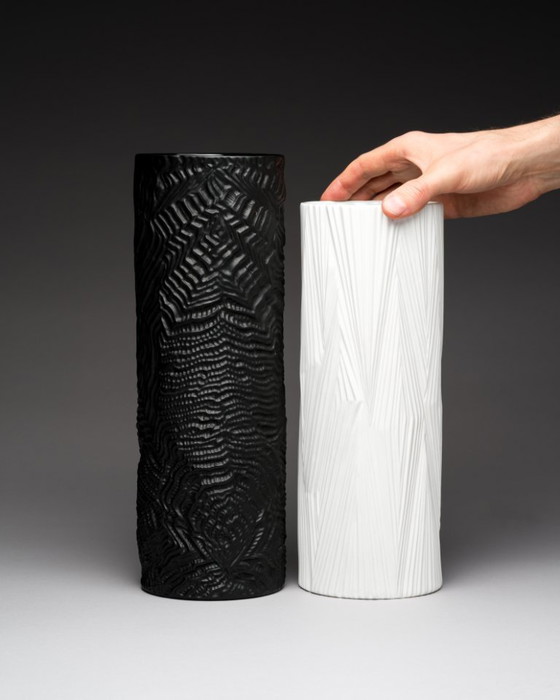 In contrast, the white vase (model 2970, height 29.5 cm) operates with precision and restraint. Its linear relief pattern introduces a controlled, directional movement—sharp, architectural, and quietly dynamic. The matte bisque-like surface emphasizes clarity and structure, offering a refined counterpoint to the expressive complexity of the black form.