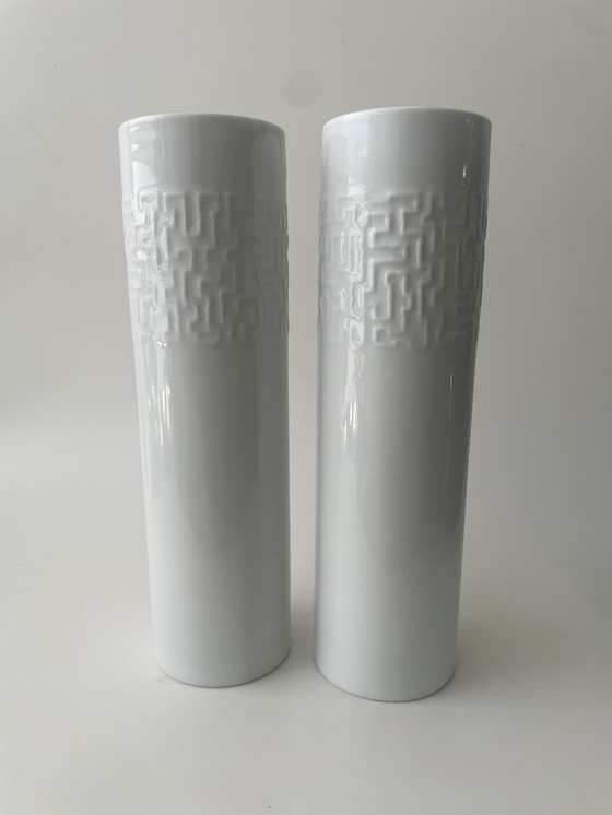 These Rosenthal Studio Line vases are a stunning example of modern design. Made of high-quality porcelain, they exude elegance and sophistication. The vases have a sleek, cylindrical design with a subtle relief pattern that adds a touch of texture. Perfect for displaying flowers or as a stand-alone decorative piece in any interior.