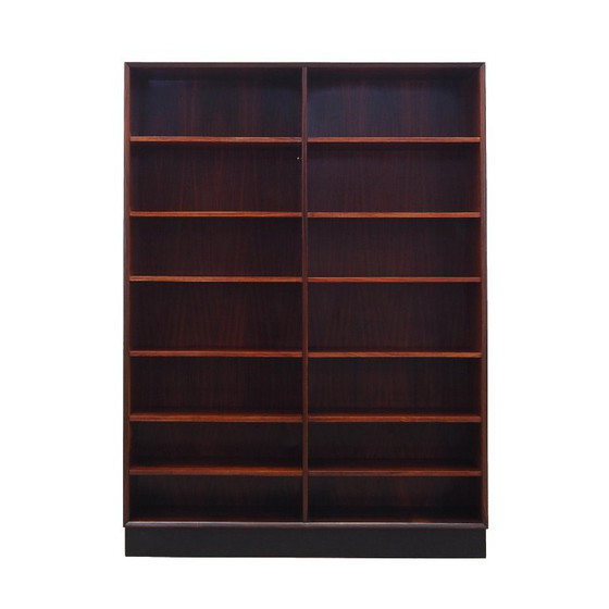 The structure is covered with rosewood veneer. The piece of furniture is placed on a wooden plinth. Inside, the space is filled with twelve practical shelves with adjustable height. The piece of furniture is an ideal solution for a large collection of books to be stored in a small living space. The piece of furniture has an opening in the back panel for a cable.
