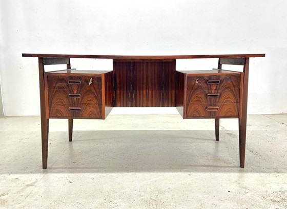 Danish rosewood desk by Gunnar Nielsen for Tibergaard. This desk features a 'floating' top with six drawers on the front and large storage section on the rear. The desk came to us in very good unaltered vintage condition, and is in truly great shape.