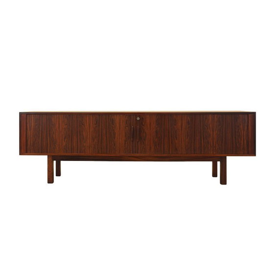 The frame is covered in rosewood veneer. The legs are made of solid wood. The surface has been refreshed. Inside, the space is fitted with three spacious drawers. The piece features a practical folding door mechanism, which reduces the need for a large clear space in front of the unit whilst not restricting access to the interior. No key included.