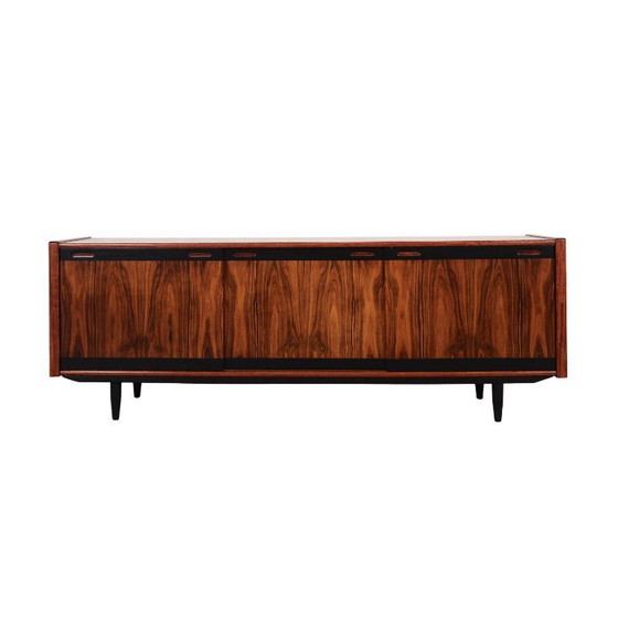 The structure is covered with rosewood veneer. The legs are made of solid wood stained black. Surface has been refreshed. Inside, the space includes two height-adjustable shelves and two spacious drawers. The sliding doors reduce the need for a large free space in front of the piece while still allowing full access to the interior. Additionally, sliding doors are an ideal solution for using the sideboard to store audio equipment.