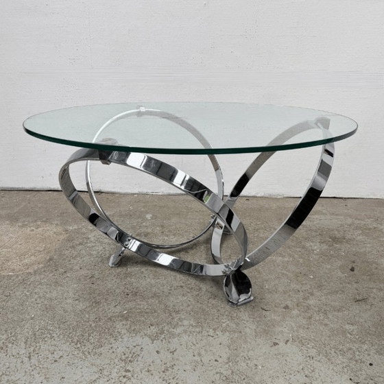 This mid-century modern coffee table by Knut Hesterberg is a design piece that immediately catches the eye. The chrome-plated base consists of interlocking, flowing rings—a signature Hesterberg design reminiscent of kinetic art. The clear glass top seems to balance effortlessly on this dynamic structure, giving the table a light yet powerful appearance.