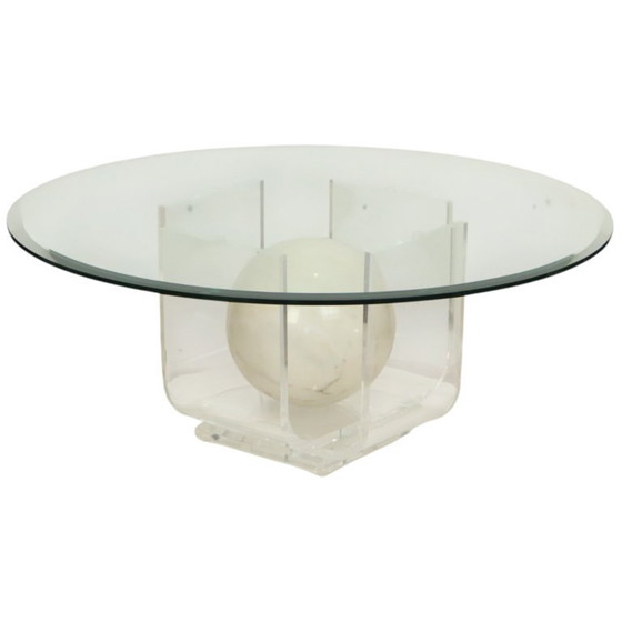 Vintage round coffee table featuring a heavy marble sphere in the center, a lucite or perspex base, and a round faceted glass tabletop; a timeless design object from approximately the middle of the second half of the 20th century.