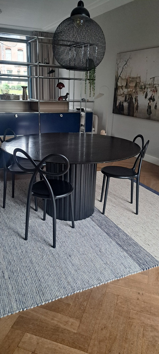 Black, round dining table from HK Living. The top and edge have some damage (no dents, but some paint is missing).