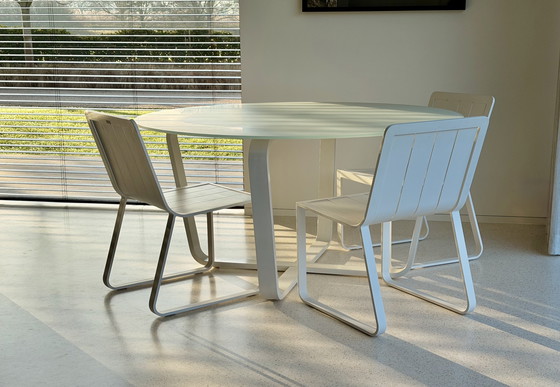 Round garden table, 150cm diameter, 76cm high. White with frosted glass Brand: Bristol Always stored indoors as a kitchen table - excellent condition!