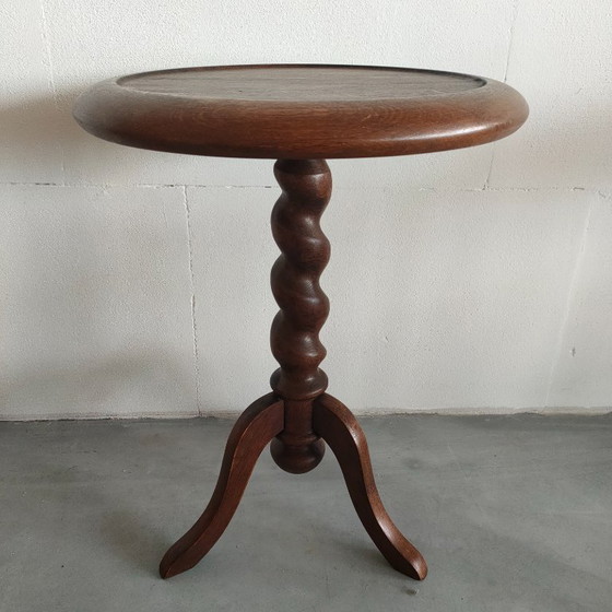 Beautiful round oak plant table/side table with a turned stand. The top has a slightly raised edge all around. Presumably antique, but not 100% certain. We have only one left in stock. The table has been treated with beeswax and has some signs of wear. We have not sanded the table further. Feel free to contact us for more information. Additional dimensions: Top thickness: 4 cm. Foot height: 20 cm. Distance between legs: 33 cm. Leg diameter: 7 cm. Shipping by post is possible; please contact us for the destination and the cost. This is a fragile item that must be carefully packaged. The listed price is per piece. Feel free to send us a message. Collection is possible; please note: Hasselt, Netherlands.