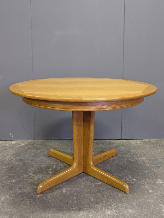 This round, vintage Scandinavian dining table with a beautiful, slender base is practical and elegant.