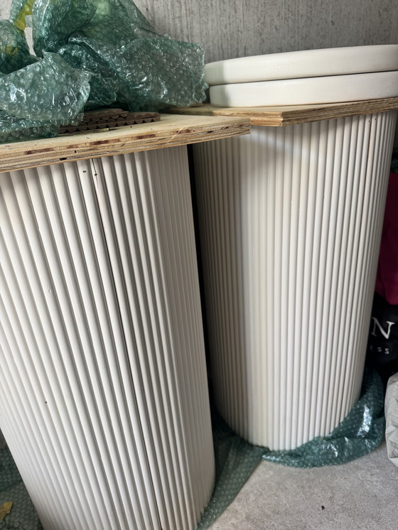 Beautiful round table legs made of high-quality wood with a relief pattern. Studio Nena Design used them as showroom models for product shoots. Dimensions: diameter 38cm and height 75cm.