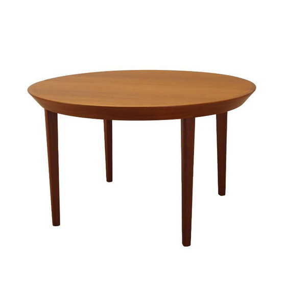 The tabletop is covered with teak veneer. The legs are made of solid wood, perfectly integrated into the table frame. The surface has been refreshed. The table has an extendable tabletop. No inserts included.