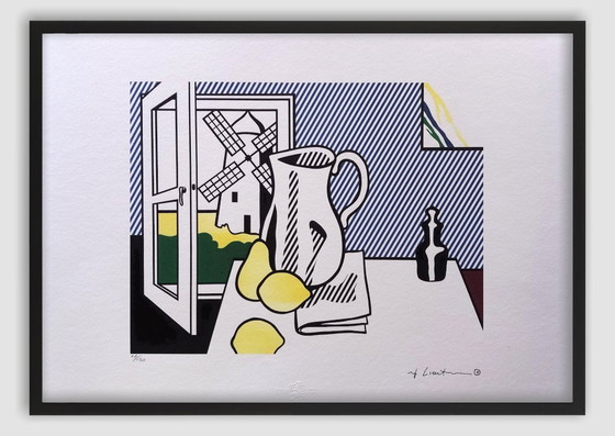 Lichtenstein's "Still Life with Windmill" presents a dual composition. It is anchored by the windmill outside, as are the objects inside the room. "Still Life with Windmill" is the most stylistically consistent print of a series of still lifes. It is a colorful figurative portrait that mimics the layout of historical landscape paintings, with the added symbolism of still lifes.