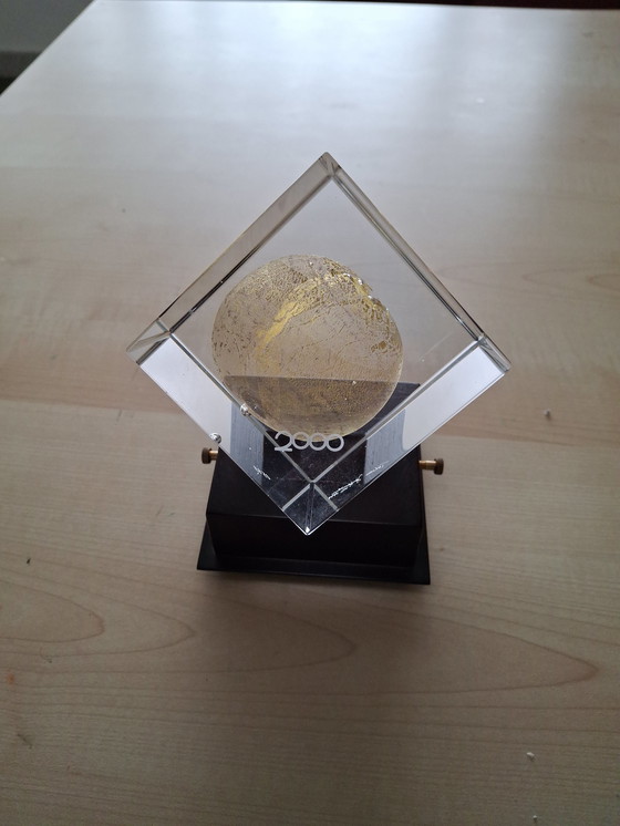This is a beautiful Royal Copenhagen millennium object, a unique decorative piece that celebrates the transition to the year 2000. The object is made of high-quality crystal and features a striking gold detail representing a globe. It is a perfect collector's item for lovers of design and history.