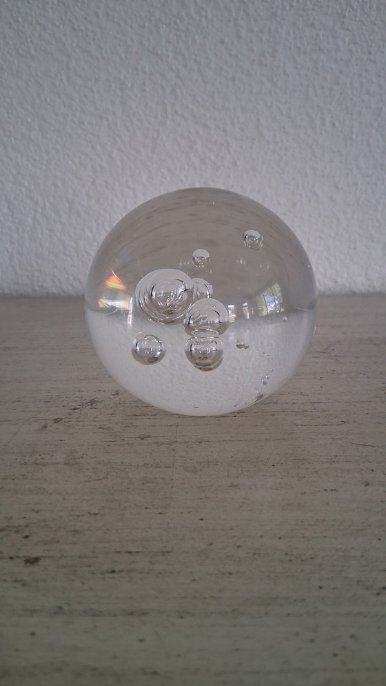 Add a touch of timeless elegance to your interior with this beautiful glass sphere by Royal Leerdam. This art object is a stunning example of craftsmanship, featuring a solid and signed design that emphasizes authenticity and value. Made of high-quality glass, with a refined finish that reflects the quality of Royal Leerdam. The sphere is signed, making it a unique collector's item for glassware enthusiasts. The transparent design with air bubbles inside adds a playful and artistic element.