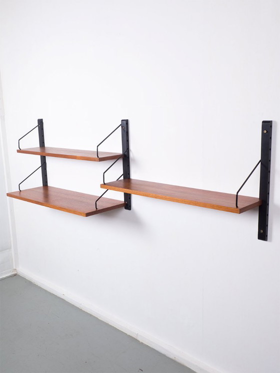 Modular wall unit, Royal system, produced by Cado in the 1950s. This system has 3 black rails and 3 teak shelves.