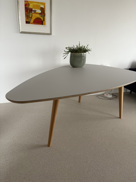 RP table with a triangular Fenix top, dimensions 196 x 122 cm, color 0725 light gray. Top height is 75 cm. The oak legs and edge are Bahama white.