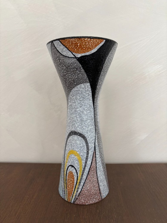 Mid-century Rumba vase by Gouda, made in the Netherlands in the 1950s. Colorful ceramic with distinctive geometric patterns, a hallmark of this unique piece.