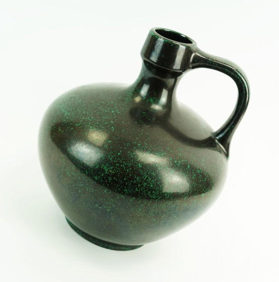 A fantastic vintage West German vase manufactured by Ruscha Keramik in the 1960s to 70s. Black glaze with a slight metallic luster and green speckles. Model number 340.