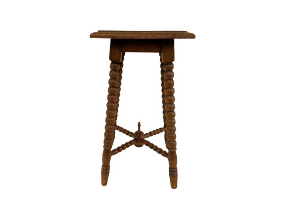 A charming rustic French plant stand featuring elegantly turned legs, this antique side table embodies the timeless bobbin table design. Crafted from dark brown wood, it doubles as a stylish coffee table, perfect for country home decor. This versatile piece adds a touch of vintage elegance to any room, making it a must-have for lovers of rustic and antique furniture.