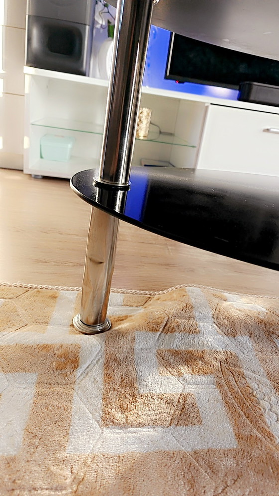 - The black glass surface adds a touch of elegance and sophistication, making it a chic focal point in any room.