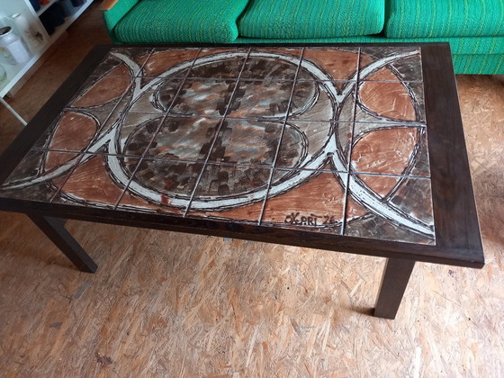 This is a vintage coffee table featuring a unique ceramic tile top with intricate patterns. The table is constructed with a sturdy wooden frame, providing both durability and style. Its earthy tones of brown, black, and creme make it a versatile piece that can complement various interior designs. Ideal for adding a touch of character to your living space.