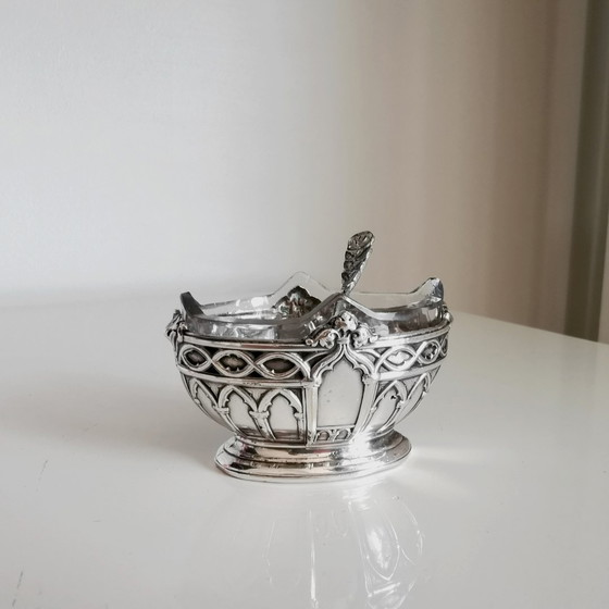 Spectacular antique salt shaker with spoon for serving salt, retains the original glass, cut at the bottom. They are in perfect condition.