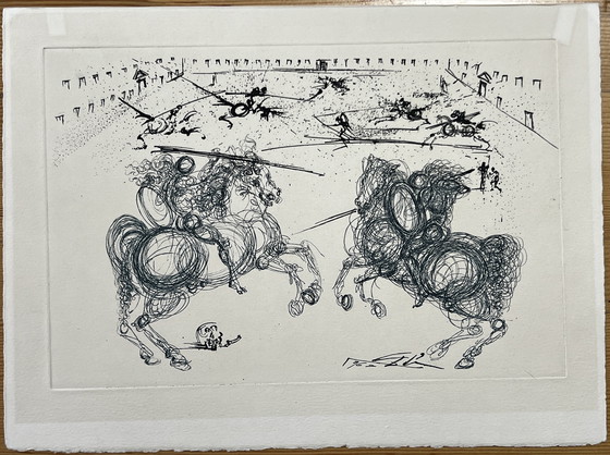 Salvador Dali. original etching signed on plate and cataloged in: catalog raisonné field -73-1-J. and Michler & lopsinger, 516. try in blue tone. paper 28.5 x 38.2 cm. work 21.5 x 32.7 cm. Sold unframed. Shipped in a tube