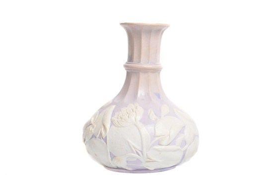 A remarkably charming antique vase/bottle titled Water Lily by Samuel Alcock & Co, of Cobridge, Staffordshire. An elegant British creation in white on lilac parian ware manufactured in 1850, which the mark on the bottom indicates. Parian ware is a biscuit porcelain imitating marble and named after Paros, the Greek island renowned for its fine-textured, white Parian marble. This bulbous jug is a beautifully crafted floral example with a smear-glazed relief in soft pastel tones and gorgeous fluting of the neck. It's obviously handmade with it being somewhat skewed and having variations to the molding, which all adds charm to this piece. A lovely little addition to multiple of interior styles. Would stand fancy on a dresser table, boudoir, desk, etc. Height 19 cm Diameter 15.5 cm