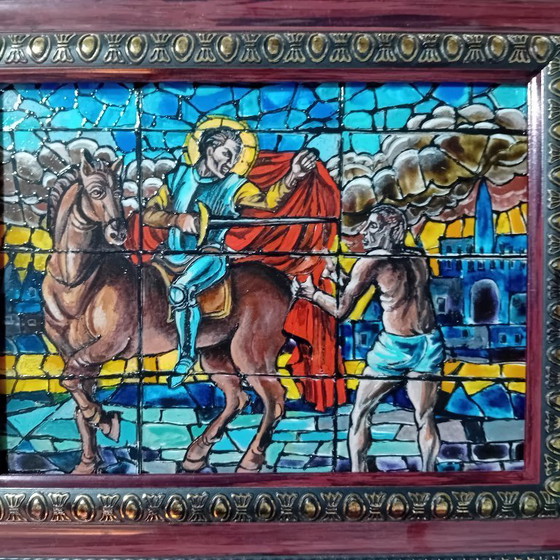 Saint Martin. The legend of how he donated part of his cloak to a beggar. Glass painting. Size 27x22.