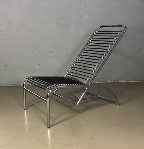 Sandows deckchair, designed by French architect René Herbst in 1928. This chair is from the 1990s and produced by Ecart International. The chair is made of chromed tubes. Back and seat is made of elastic cord. The back is adjustable by means of a movable tube behind the back.
