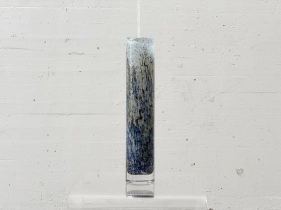A slender, elegant studio glass vase from the Swiss manufacturer Sarner Glas, crafted using the characteristic Efeso technique – an elaborate glass finishing process rooted in the Murano tradition and developed in collaboration with Italian glassblowers. The tall, cylindrical form impressively emphasizes the depth and movement of the material. Fine, vertical inclusions in shades of blue, gray, and white permeate the glass, creating an almost organic surface reminiscent of mineral structures. Trapped air bubbles and metallic-looking particles lend the vase additional depth and a vibrant play of light. The solid, clear glass base provides stability and underscores the high-quality craftsmanship, while the overall substantial weight emphasizes the quality of this mouth-blown piece. Its minimalist design gives the vase a distinctly modern feel, making it suitable for both standalone displays and combinations with other studio glass objects. A classic collector's item with a clear connection to Murano aesthetics and a distinctive character.