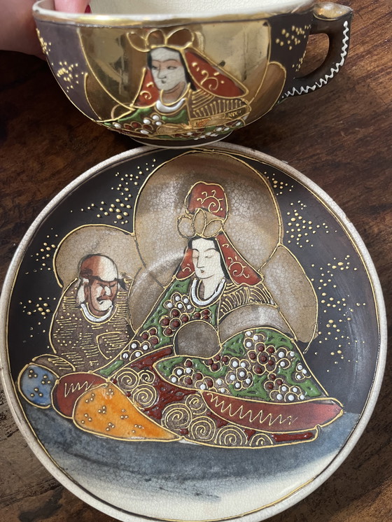 Satsuma earthenware cup and saucer. Typical beige earthenware with crackle finish. Beautiful relief in the design. Saucer diameter: 13 cm. Cup diameter: 9.5 cm and height: 4.5 cm. Some gold loss on the handle and plate, nothing unusual considering their age.
