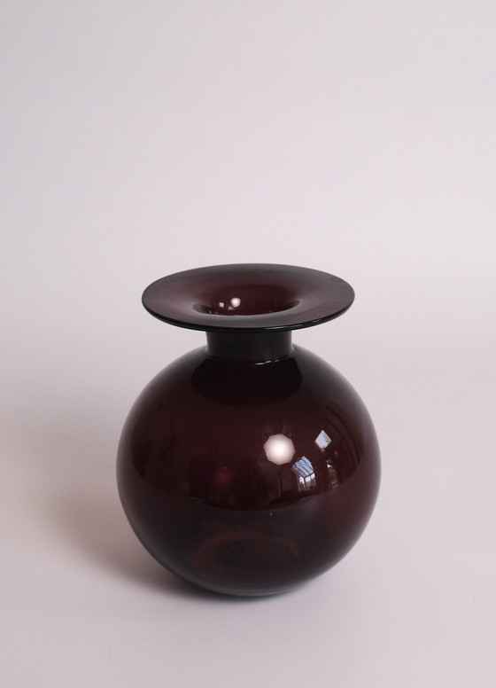This Saturn vase was designed by Nanny Still in 1960. It has a sleek, spherical design with a deep black color with eggplant tones, characteristic of the aesthetic of Mid - Century modern. Made of high-quality glass, this vase is both functional and decorative, perfect for adding a touch of elegance to any room. Its unique shape and design make it an eye-catching piece for collectors and lovers of vintage interiors.