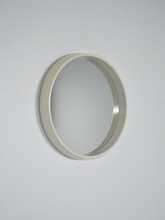 1960s round mirror with rigid cream-white plastic frame, protruding rim and clean Nordic lines.